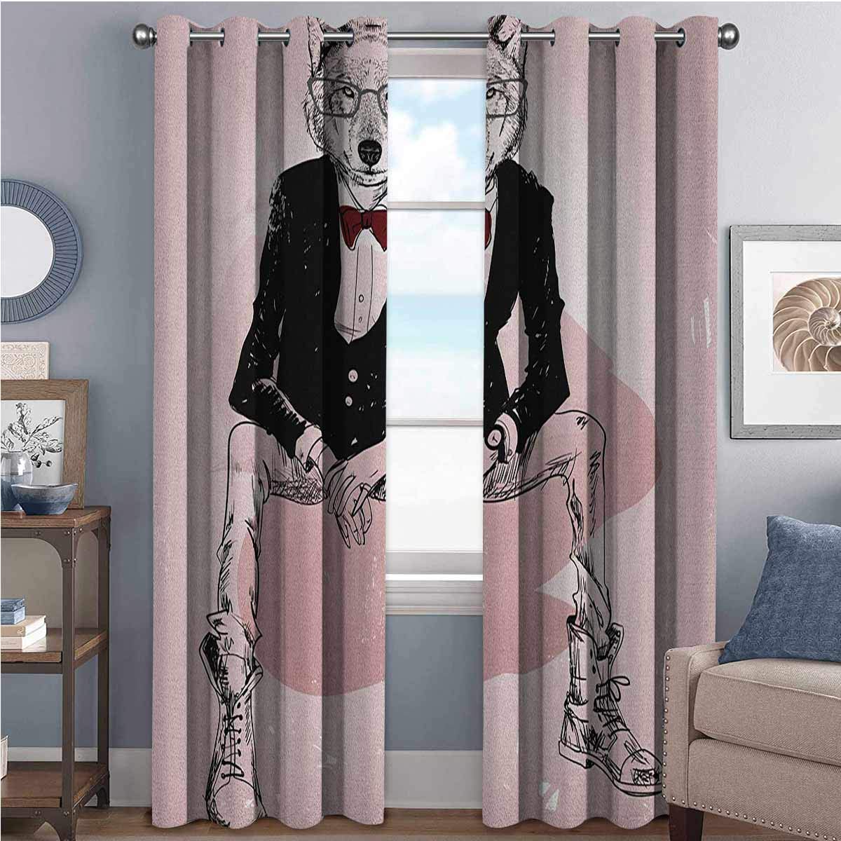 Title : Toopeek Indie Shading Insulated Curtain Hipster Portrait of Sitting Wild Wolf with Glasses Smart Casual Outfit for Living Room or Bedroom W52 x L63 Inch Baby Pink Black Burgundy