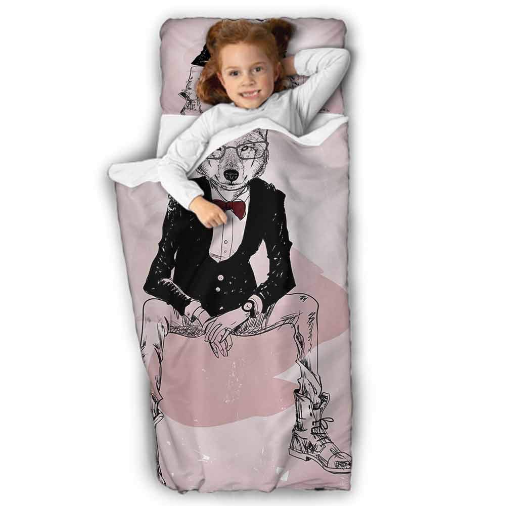 Real Title : Indie Kids Sleeping Bag Hipster Portrait of Sitting Wild Wolf with Glasses Smart Casual Outfit Soft Microfiber for Preschool Baby Pink Black Burdy 43X21 INCH