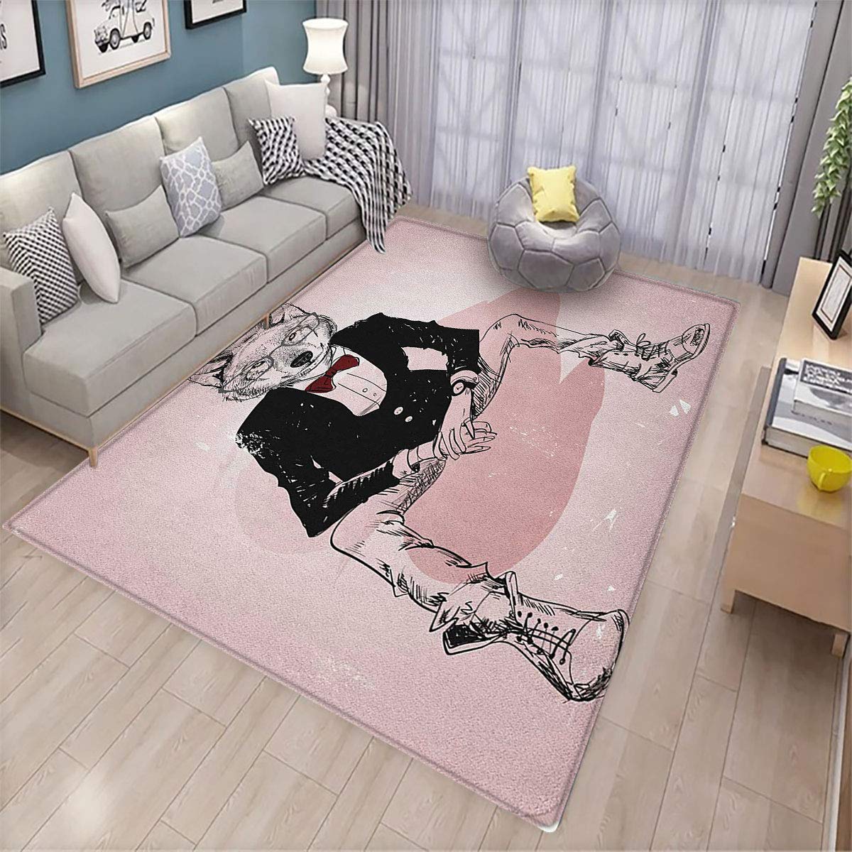 Real Title : Indie,Indoor mat,Hipster Portrait of Sitting Wild Wolf with Glasses Smart Casual Outfit,Can be Used for Floor Decoration,6.6'x10' Baby Pink Black Burgundy