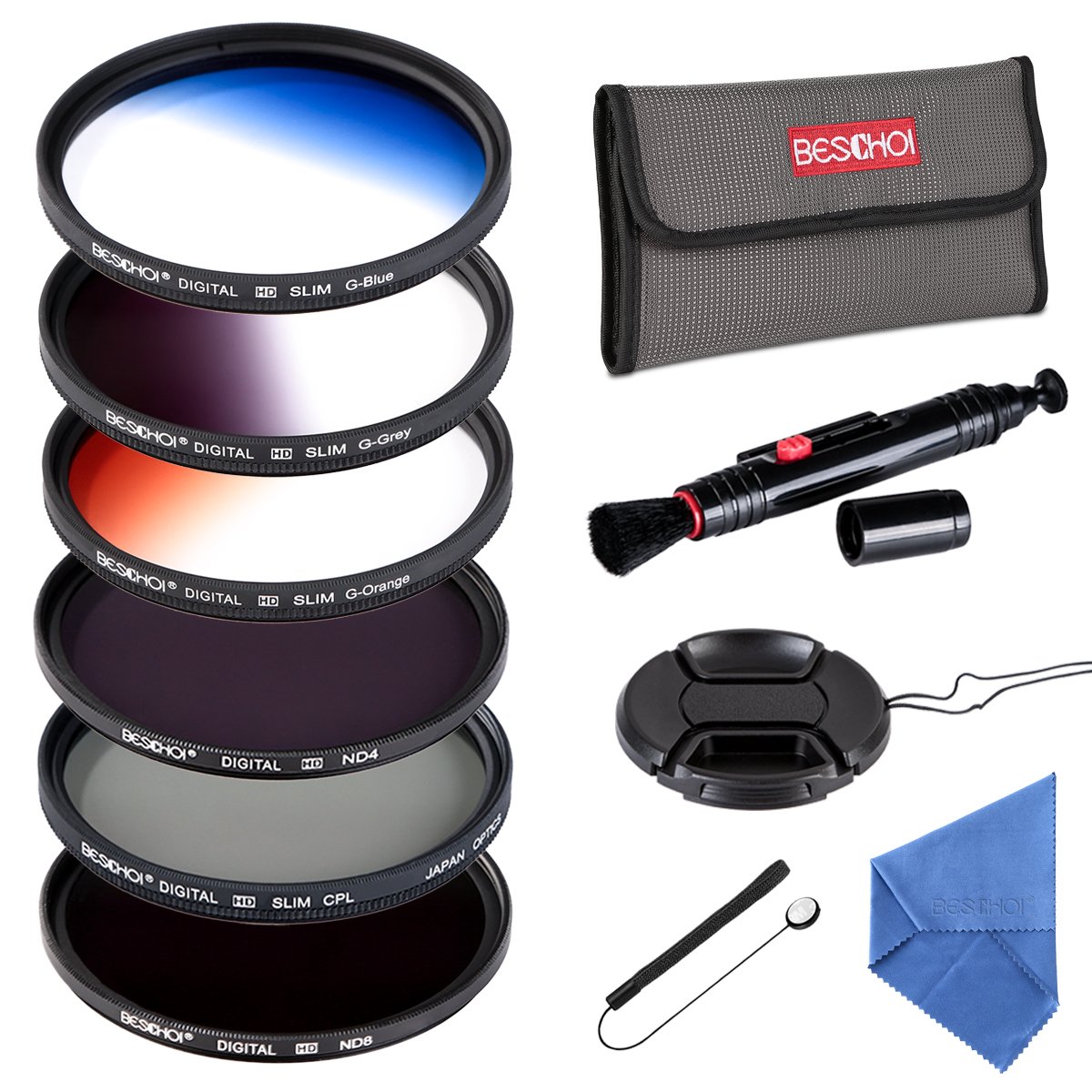 Real Title : Beschoi 77MM ND Filter Kit (ND4 + ND8), Graduated Color Filter Set (Orange Blue Gray), CPL Filter, Center Pinch Lens Cap + Cap Keeper Leash + Lens Cleaning Pen + Filter Carry Pouch + Cleaning Cloth