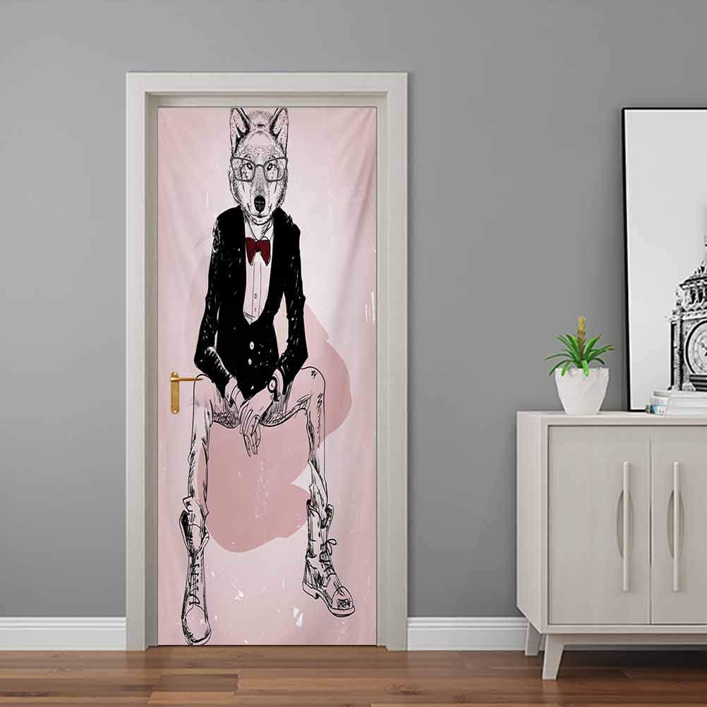 Title : Indie Mural Stickers Hipster Portrait of Sitting Wild Wolf with Glasses Smart Casual Outfit DIY 3D Door Wall Stickers for Home Office Renovation Decor Baby Pink Black Burgundy - 23"W x 70"H